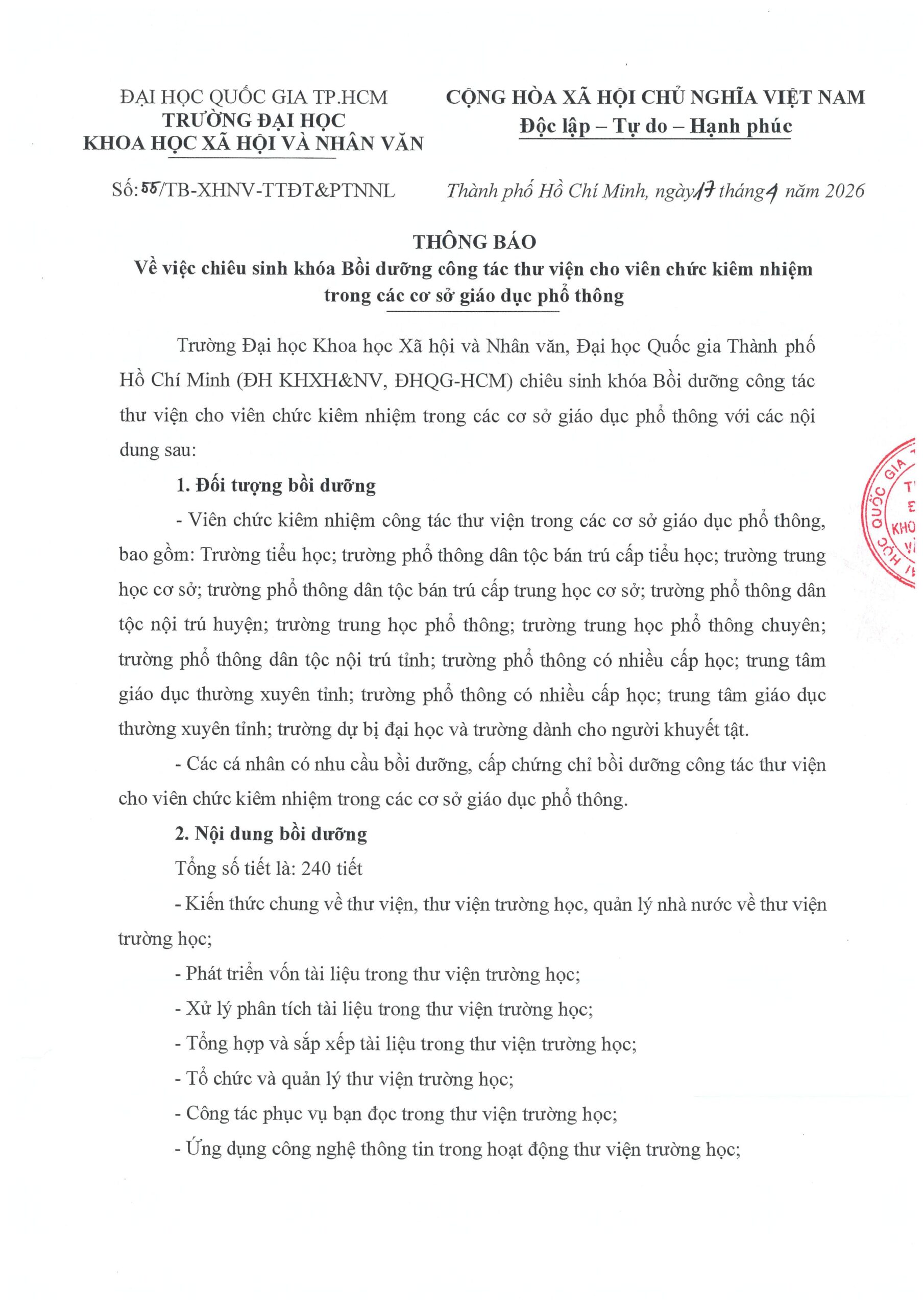 Thông báo về việc chiêu sinh khóa Bồi dưỡng công tác thư viện cho viên chức kiêm nhiệm trong các cơ sở Giáo dục phổ thông năm 2026