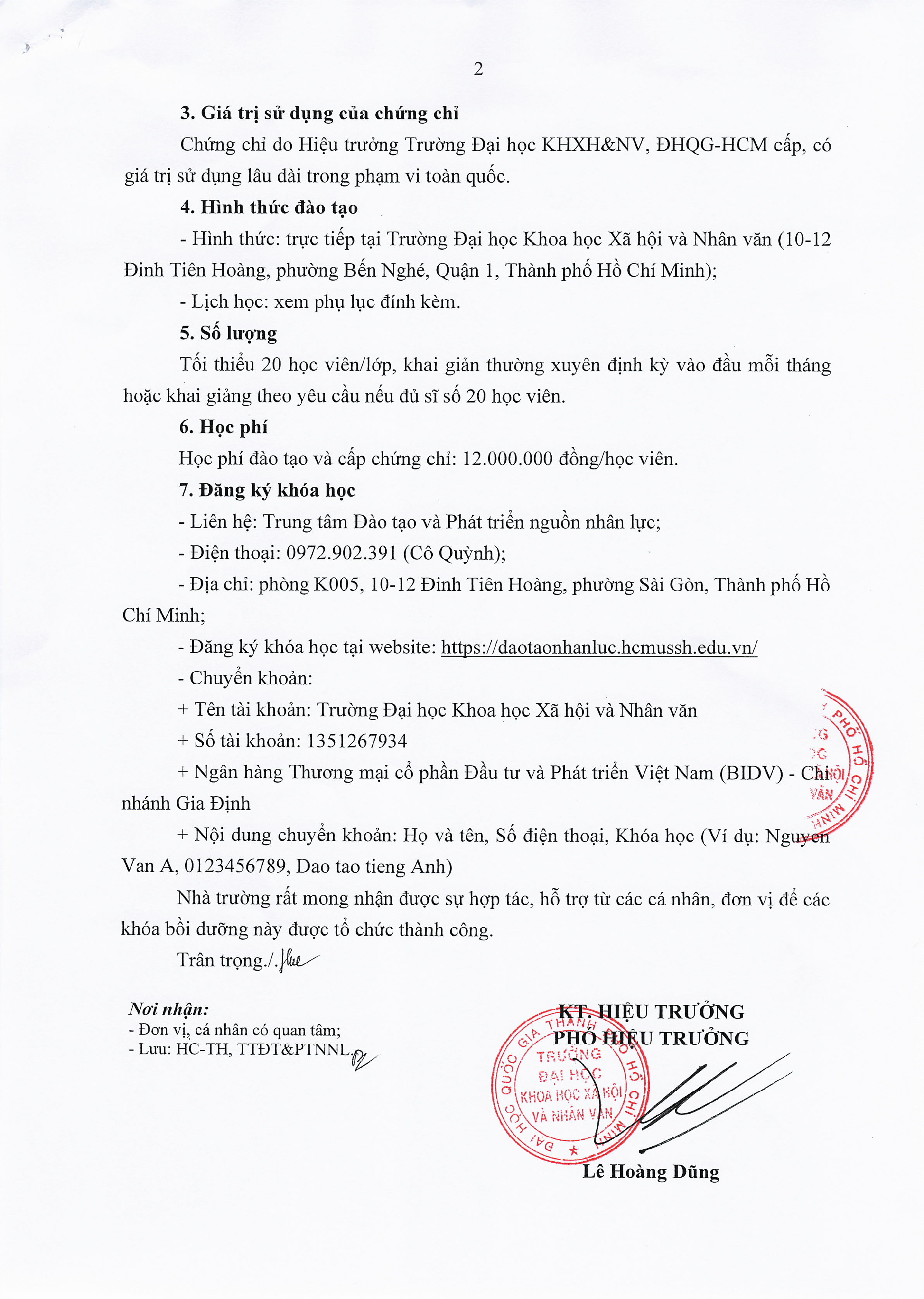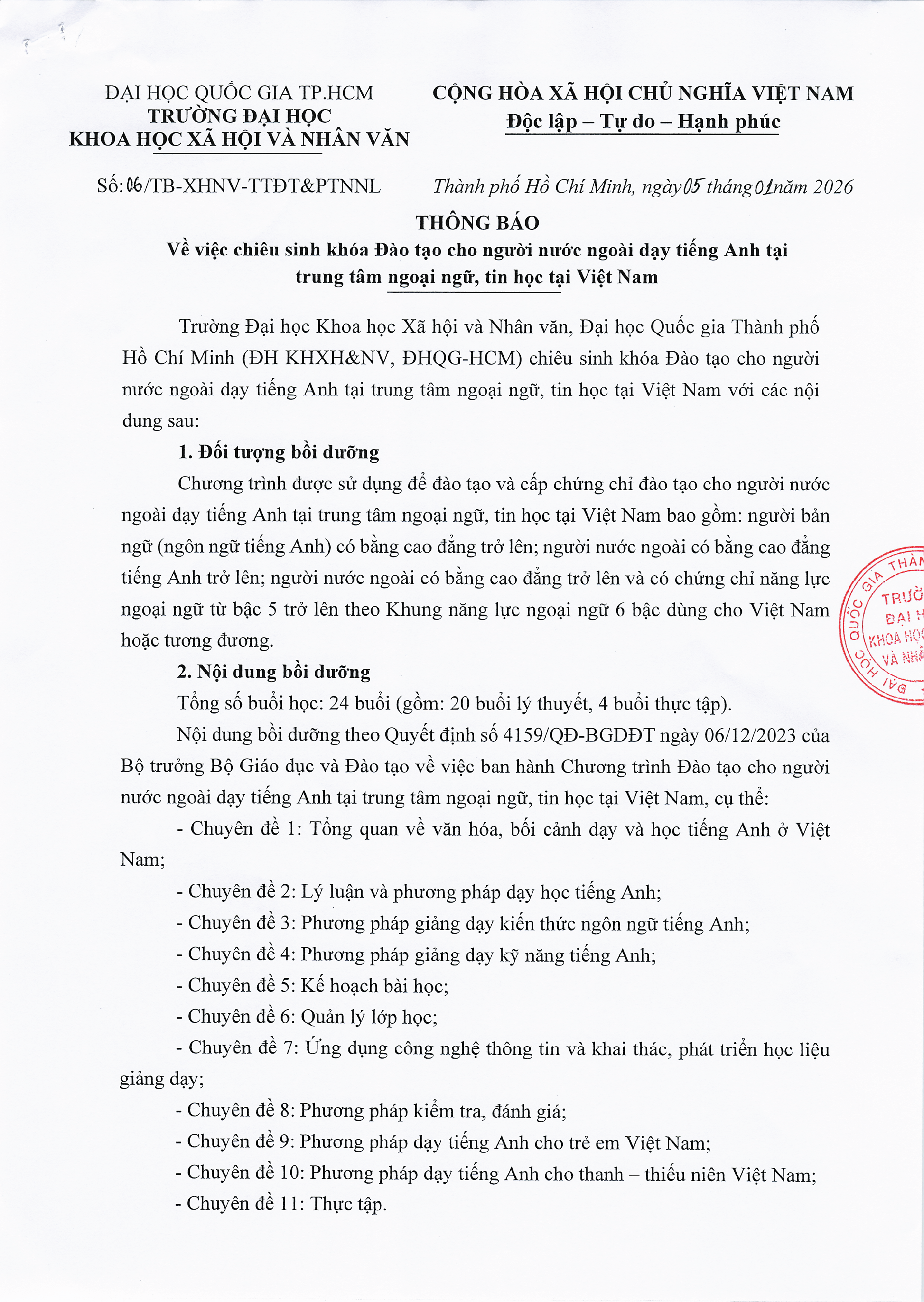 Thông báo về việc chiêu sinh khóa Đào tạo cho người nước ngoài dạy tiếng Anh tại trung tâm ngoại ngữ, tin học tại Việt Nam năm 2026